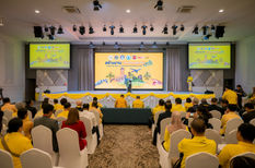 our venue, featuring exhibition booths from top phuket brand, a spacious pre function area, high ceilings, and a photo backdrop at the entrance.